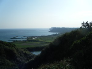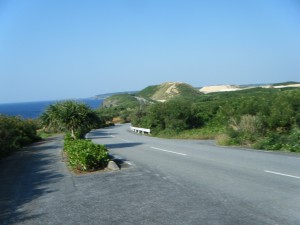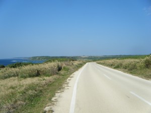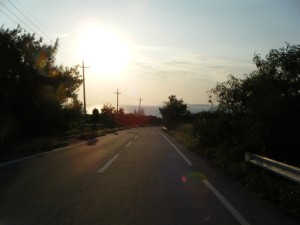 この辺りから、時々海が見えるようになって来ました。島の東側を南に向かって走って行きます。朝日がまぶしく、きれいです。