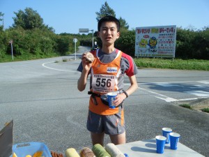 島の南側の海沿いを西に向かって、スタート地点に戻って行きます。アップダウンが多少あって堪えますが、あとは気合です。後ろから続いているチャレンジャーの1人もほぼ順調で、10分差くらいで来ているようです。あまりいいペースなので、エイドの準備ができていないところもあるし、あまり差が開くようならゆっくりしようかと思いましたが、これならそのままのペースで良さそうです。