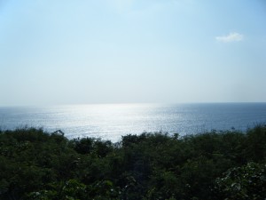 それにしても、帰りの向かい風はもの凄くて大変。走っても全然進みません。ついに歩いてしまいました。全体的に島では風が強かったですが、ここでの風が一番強かったように思いました。もうゴールは間近なので、無理に頑張ろうとせず、この素晴らしい海の眺めを堪能しながら歩を進めました。ゴール地点にあるホテルは海の向こうにもう見えています。