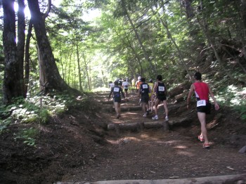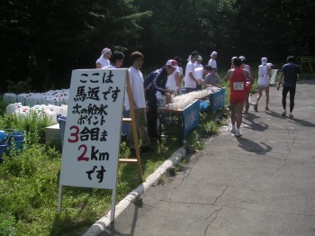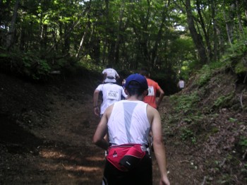 そして11km地点の馬返し。標高は1450mで、すでに700mくらい上ってきている。水、水。そしてここからが本番。地面もアスファルトから土に変わり、登山道っぽくなってきた。ここまでは何とか走ってきたが、かなりきつくなってきた。ちょっと飛ばしすぎかな。