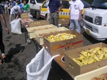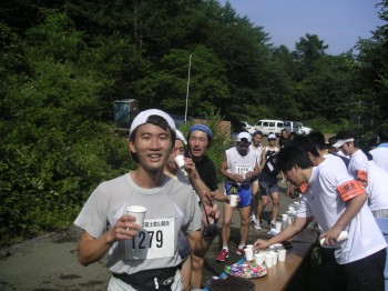 最初の給水所は7.5km地点。やはり暑いようで大量の汗をかいているので、水はしっかり補給しておく。この先あまり給水所はないようなので。あと梅干し。汗をたくさんかいているので塩分補給も欠かせない。