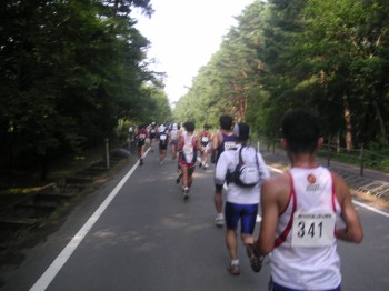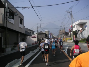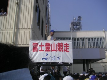 そしていよいよスタート。予想通り前のほうはすごい速さで飛び出していくが、ここは自分のペースを守ってマイペース。しばらく行くとずっとまっすぐな上り坂に出る。いきなりきたか。そしてはるか前方には富士山。あんなに高いところまで上るのか・・・。信じられない。