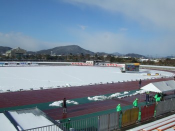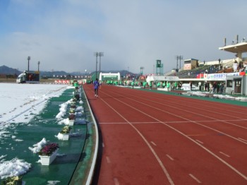 マラソン当日、朝起きて外を見るとびっくり。なんと一面銀世界!しゃれにならないぞ。こんな中を走れるのか?防府駅からバスでスタート・ゴールの陸上競技場へ。トラックは雪かきされているが、やはり銀世界。寒い。