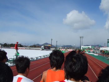 スタート。テレビ中継のためにジャンプしようとしたがそんな気もしないくらい体が固まっている。まずはトラックを一周して、競技場の外へ。