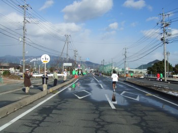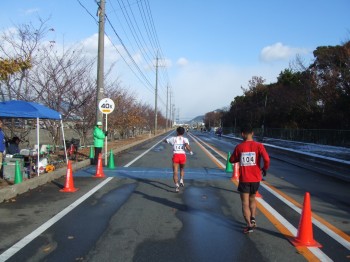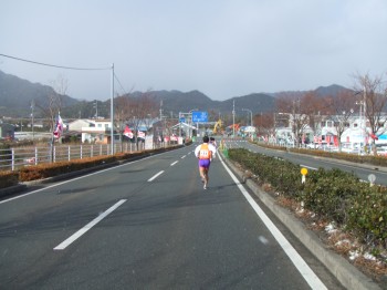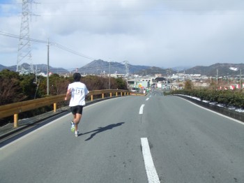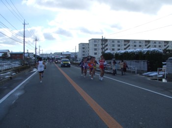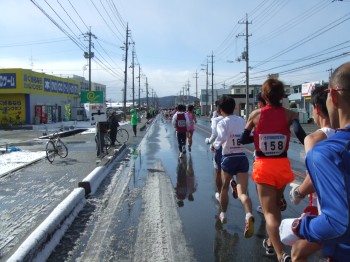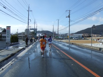 防府駅の近くに来ると沿道の声援が大きくなる。雪の残りも少ない。前の集団からこぼれてくる人はまだいない。15km通過、54分52秒でこの5kmは18分6秒。向かい風にしては頑張っている。これ以上上げるのは無理だ。そして方角が変わり追い風に。少し走りやすいぞ。でも少し脚も重くなってきたがまだ前半、少し抑え目に変更。折り返してくる先頭集団とすれ違う。ペースメーカーが先に行っちゃっているぞ。いいのか?去年よりすれ違う場所が後ろになっている。少しうれしい。
