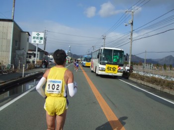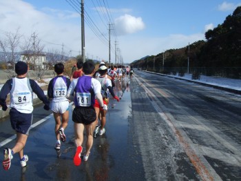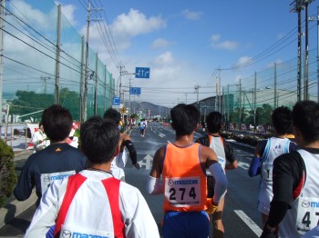 ぐるっと一周して競技場の横に戻ってきた。これで風向きも分かり、向かい風では風よけがいないとかなりきついことがよく分かった。しかしこの集団のスピードも何だか遅めに感じる。みんな前を走りたくなくて、前のランナーも向かい風を受けて飛ばしていけないのか?去年の四万十川100kmのときにラストでかわされた2歳上の仲良しさんが前の集団を追いに飛び出した。2時間30分を狙っているらしい。僕も遅れて追いかける。でも途中であきらめてマイペースに戻す。そしてこの方角は完全に向かい風だ。一人旅で風を受けつらい。失敗したか?とりあえず前の集団とは行っての距離を保ってついていく。