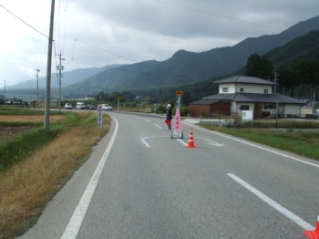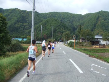 大町市の陸上競技場からスタート。すんなり前の方に並ぶことができた。9時20分、スタート。あまり飛ばしすぎず、周りを見ながら走ろう。もちろん初めから飛ばしていく人たちもいる。そして、競技場を出るとさっそく空の広い山あい、安曇野盆地を走る。