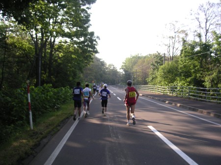 45km過ぎたころからアップダウンが多くなってきた。このコースはほとんどアップダウンがないと聞いていたが、思ったより大変なアップダウンがいくつも続く。またか、またか、まだあるのかっていう感じ。徐々に脚の動きが鈍くなってくる。重たく感じられるようになってきた。しばらく一緒に走っていた10代の大学生は元気に先へ行ってしまった。50kmを過ぎると急激に脚が動かなくなった。まだ半分あるぞ。