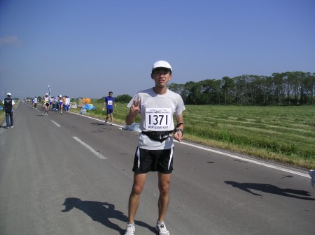 しばらく走っていると、突然沿道の人から名前を呼ばれた。以前に大会で知り合いになった人だった。びっくりした。写真を撮ってもらった。そういえば、走るのに集中していて写真を撮ってもらうのを忘れていた。