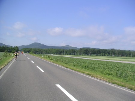 とにかく北海道は広い。特に空が広い。天気も素晴らしく、雲ひとつないきれいな青色をしていた。30kmを過ぎてもペースは1キロ5分イーブン。狙い通りである。調子よくても飛ばしすぎない。