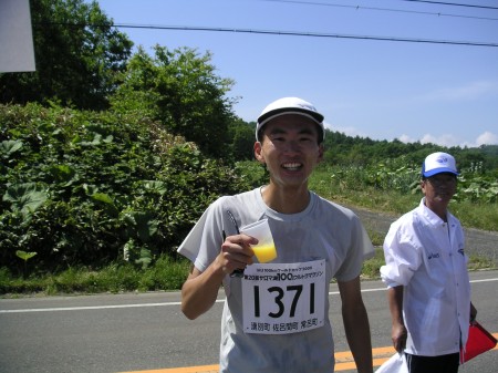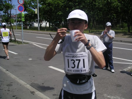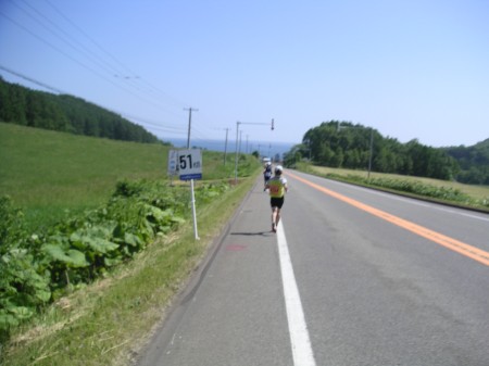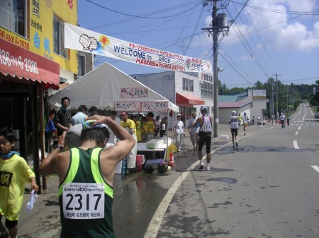 50km地点にあるちょっとした丘を越える。もうだめだ。再びサロマ湖へ向けて下っていく道。下りなのに前に進む気がしない。青い海、いや湖。飛び込んでしまいたくなる。その下ったところに給水所があって助かった。これまではほとんど滞在することのなかった給水所だが、長居しないとやってられない。