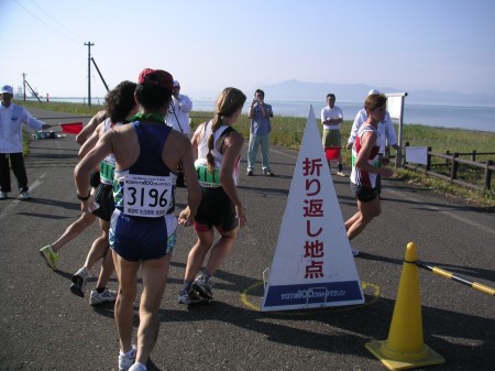 そして両側を海と海のような湖とに挟まれた一本道を戻っていく。後ろには大勢のランナーが続いていた。