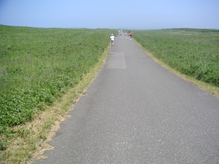 ようやく80km。そしてこの先は、ついにこの大会のクライマックス、ワッカ原生花園の往復20kmだ。サロマ湖とオホーツク海に挟まれ細長い半島のように突き出した岬に向かって10km行って、同じ道を10km帰ってくる。多くのランナーともすれ違う。原生花園とは手のつけられていない地帯ということだと思う。美しい。しかしどこまでも続くほぼまっすぐの一本道。微妙にアップダウンも繰り返す。ところが、ここまで無理をせず歩きながら来たせいか、ようやく少し復活してきた。何とか走れる。太陽に向かって果てしなく続く道を行く。