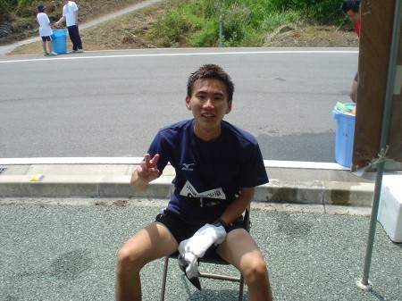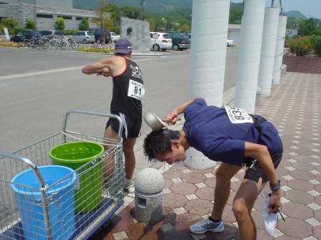 60kmを過ぎ、本格的にきつくなってきた。まず太もも前後、ふくらはぎはもちろんだが、手足が軽くしびれる。血液が十分に循環していないようだ。座って力を抜くと、血が流れていくのが分かる。すーっと。だから筋肉中にたまった疲労物質が流れていかないのだとは分かったが、積極的にどうすればいいかは分からない。休んでいればいいのだろうが、時間は流れていくのでずっと休むわけには行かない。そしてお腹もやられている。暑くなってきたのもあって、水を飲みすぎたのか胃液が薄まったようでおなかがたぽたぽ、水も食料も吸収されない。もはや内臓として機能していない。50km過ぎから最後までほとんど何も食べられなかった。何も食べないとエネルギーが出るわけはない。さくら道のときにお世話になったパンシロンを持っていけばよかった。光化学スモッグっぽい気もして気持ちも悪い。