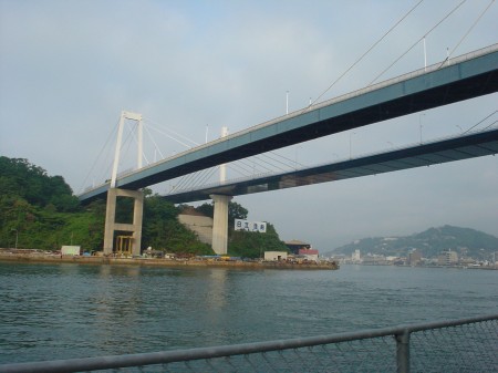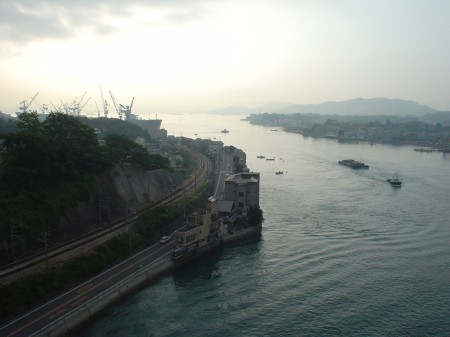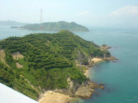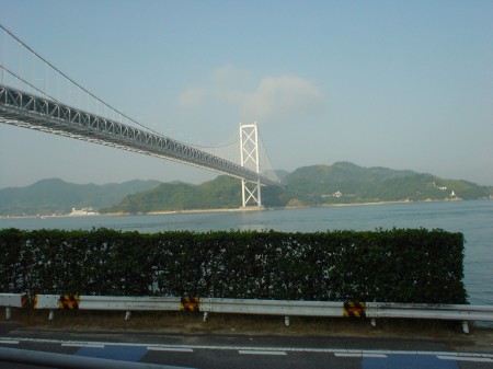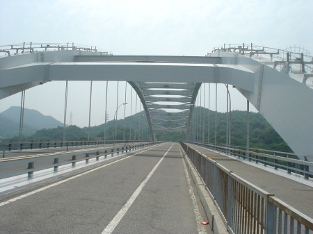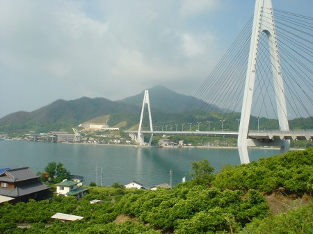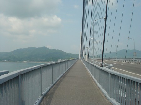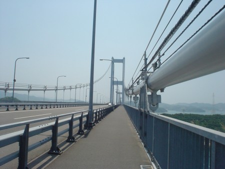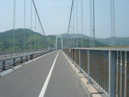 そして次の島、因島へ向けてまた頭上にかかっている橋まで上って橋を渡る。海は緑色がかかっており非常にきれい。橋もきれいでかっこいい。この橋は原付・自転車・歩行者と自動車道路が完全に分離しており、2層式になっている。走行者は道路の下。長さも結構あり、走ると橋が揺れて変な感じがする。