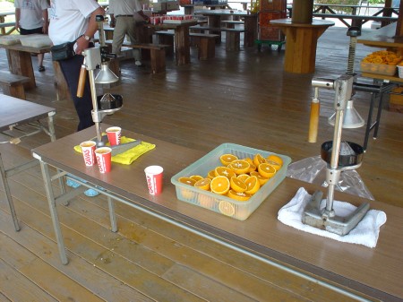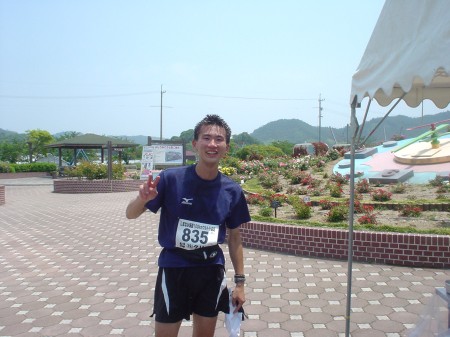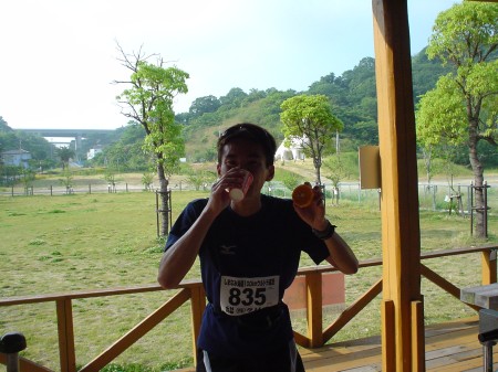 因島といえばみかん!(いや、いよかんか?とにかく柑橘系のオレンジ色のやつ)実を直接絞って飲ませてくれる。去年は2杯飲んだらもうだめと言われたが、今年は何杯でも飲んでいいといわれた。コップいっぱいのオレンジジュースを作るのに、実を1個半使っている。あまり飲みすぎるのもなんなので3杯飲んで終わりにした。(ゴール後にそこにいたおじさんに会ったときにいっぱい飲んで、といわれてしまった。ゴール後にもまたもらった)とってもおいしい。ここへの到着は4番目なので他のランナーも少なく、実もたくさん残っていて非常に待遇がいい。