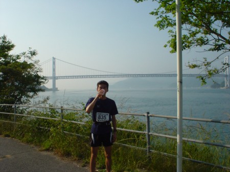 そして85km通過。だんだん元気になってきた気がして、前のランナーも徐々に見えるようになってきて、ついに見えてきたのは来島海峡大橋。大きな3連つり橋でとってもかっこいい。去年はこれに最も感動した。全長4kmくらい。この90kmという距離でこの長さ、しかも上り下りのあるこの橋を渡るのはかなり辛いのだがもう最高。海はこれまでで最もきれいで景色もいい。どうせあと10kmくらいなので、このまま最後まで持ってくれと思い、橋の手前のエイドで一息入れてから頑張る。