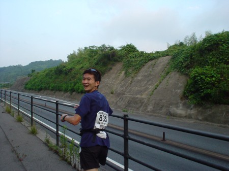 参加申込者は約1000人。その人数が一斉にスタートするが、初めから飛ばす人はほとんどいなくて、僕が一番前になってしまった。先導は自転車の2人。前に行かれると自然に追いかけたくなってしまう。しかしいきなり飛ばしてしまうと絶対ばててしまう。何とか気にしないように走るが、やはりトップを走行。入りの10kmは46分30秒。前半は10km50分ペースで行くつもりだったので、ちょっと速め。ペースを落とそうと思うが、同じペースで走っていた人が話し好きのようでペースを変えられない。さすが営業さん。先に話しかけたのはこっちなので仕方がないが。ついつい予定より速めのペースで走り続けてしまう。相変わらず先頭。先導の自転車の人とも話をしていたが、走っているところを初めて写真にとってもらった。