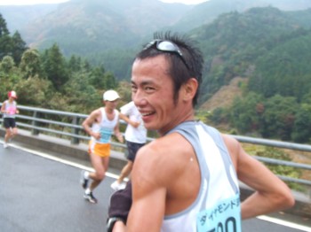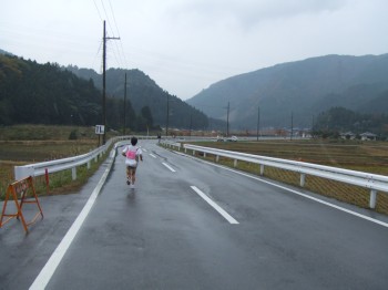 そして、白バイが後ろからやってきたと思ったら、景気のいい足音が。こんなところでこんな飛ばす人がいるのか?すると後ろから、遅れてスタートしたハーフの先頭ランナーが駆け抜けていった。ん?あれは早田選手じゃないか?少し前まで現役のトップ選手で世界にも挑戦していた有名ランナーだ。一言話がしたくてダッシュ。写真を撮らせてもらい、一言声をかけて見送る。かっこいいなぁ。ハーフとはいえ全然スピードが違う。あっという間に見えなくなってしまった。