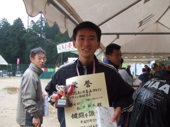 ラスト1km。4分でカバーすれば2時間50分を切れる。つまり前回と同タイムだ。最後頑張ってダッシュしてみるが、ゴールは見えているのにわずかに届かない。2時間50分20秒でゴール。全然自分がどの辺の順位で走っているか分からずに走っていたので、順位も分からない。何か首からかけられた。完走のメダルかと思っていた。あとでふと見ると「7」と書いてある。順位のようだ。また今回も前回と同じ7位。しかもタイムもほとんど同じ。ただ全体では12位で、陸連登録男子の部で7位のようだ。スタートしてすぐに大勢前に行って、その後は抜かれてないけどあまり抜いてもいないので表彰はあきらめていたが、うれしい。待っている間は寒かったが、前回よりも立派な表彰式、賞状、小さなカップ、何か副賞がもらえた。やった。