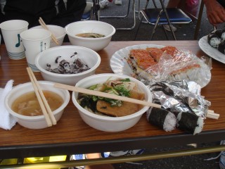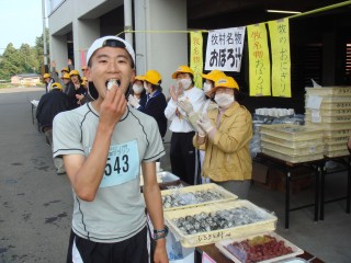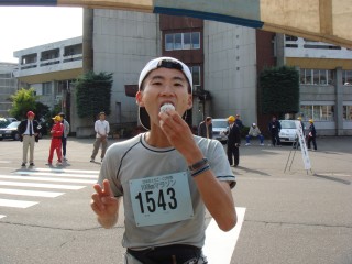 終わると、ボランティアの中学生たちがいろいろお世話をしてくれた。いい大会だ。座っているだけで、飲み物や食べ物や、荷物まで持ってきてくれるし話し相手にもなってくれる。豚汁、うどん、おにぎり、頚城の押し寿司、果物など食べ放題。食べる気満々でいろいろ持ってきてもらったのはいいけど、さすがに少しきつい。ゴールしたランナー達と話をしながら少しずつ食べる。豚汁、うどん、おにぎりは何とか完食。お風呂もあるというので連れて行ってもらう。
