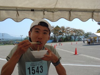 大きな坂は終わっても残りはあと25kmもある。このペースが最後まで続くか自信はない。でももう下りはないので、お腹にものが入っていてもそうお腹が痛くなることはないだろう。ということで、大きなレストエイドではおにぎりだけでなくそばもいただく。せっかく勧められたので。ここらで補給しておけば、もう最後まで食べなくても持つだろう。