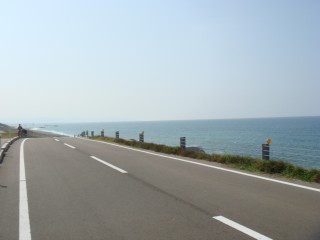 90kmを通過。この10kmも45分台でカバー。大きな国道を渡るときに信号待ちさせられたりしたのに、いいペースだ。あと10km。そして今回の楽しみの一つである日本海の大パノラマがこのすぐ先に待っている。前回は台風だったので海はほとんど見えず残念だった覚えがある。今年はとてもいい天気。予想以上の大きな青い日本海が広がっていた。エーゲ海の青とは違う青。何で同じ海でもこうも色が違うんだろう?