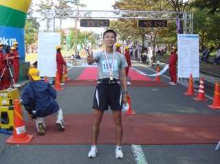ラスト数kmは辺りの開けた田園地帯へ。ずっと後ろを見ても追いかけてこない。表彰台だ。ほっとして気がぬけそうになるが、気を抜くと走れなくなりそうなのでもう少し頑張る。あと2km、あと1kmが長い。そして、ようやくゴール地点が確認できた。リージョンプラザはにぎわっていて、放送で紹介される中ゴールを目指す。「前回は20位でしたが、・・・。」