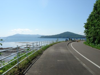 50kmを前にして、ようやく体がほぐれてきたような感覚。ペースを上げたいが我慢。アップダウンのある区間にもかかわらずペースは変わらず、10km48分。湖は美しいサロマンブルーをしている。