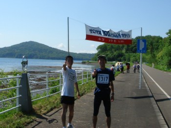 そして、湖沿いの道に出て42.195kmを通過。20km前から話しながら併走したりしていた、いろんな大会で会う2つ上の20代ウルトラランナーの佐々木さんと一緒に記念撮影。