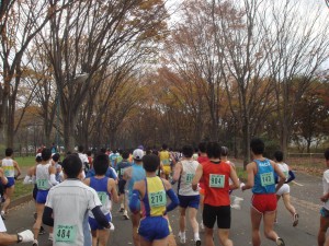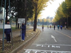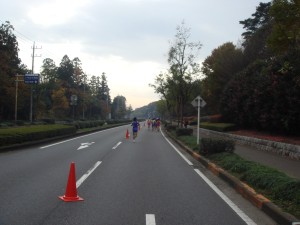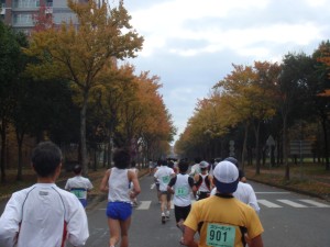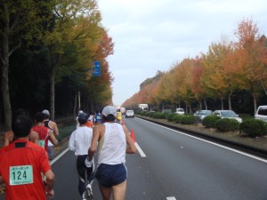 スタート!そこまだ寒くは感じなかったので半そでで出走。記録を狙っている人が多いからだろうが、みんな一気に飛び出す。僕は控えめに、どのくらい走れそうか確認するように走り出す。まずは学内を周回。どのくらいのペースで走り出したのかよく分からない。感覚的にはゆっくりめ。紅葉が進んでいるところで、走っていて気持ちがいい。