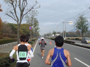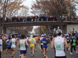 15km、20kmとイーブンペースで通過。そろそろ少し脚が重くなってきてペースの維持が大変になってきた。折り返しコースなので先頭グループとすれ違った。招待選手で、今年の春まで会社の陸上部にいたオリンピックメダリストのワイナイナ選手が走っているらしいが、ちゃんとトップで走っていた。