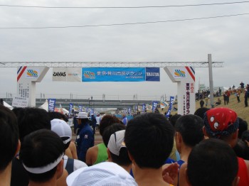 会場はとてもたくさんの人であふれていたため、トイレに行くことができずにスタート地点へ。これから晴れてくるとのことなので、少し寒いけど半袖短パン。陸連登録者なので前からスタートできるが、スタート地点もすでに混んでいたため少し暖かい。そして朝9時、スタート。準備運動も全くなしで、筋肉が固まっている。