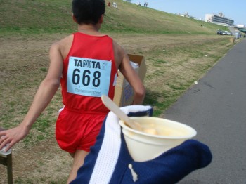 35km過ぎの給水所にはシャーベットが置いてある。前はこれを楽しみに走っていたが、最近速く走るようになってからは食べる余裕がなくなっていた。でも今日はもうタイムは気にしていない。ほとんど給水は摂っていないのだが、このシャーベットはしっかりGET。やはり速いランナーは食べてる余裕がないようなので、「食べてくれた。」とボランティアの子供が喜んでいた。先輩もしっかりGET。