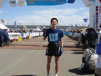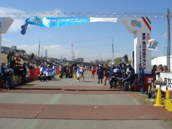 ようやくゴール。旗や幕のなびき方を見れば風の強さを分かってもらえる?かな。タイムは手元で2時間40分25秒。2時間40分は切れなかったが、この向かい風でこれだけ苦労しても40分でまとめられたのは満足。そして前半を5km18分以内で余裕を持って走ってこられたのも自信になった。途中で24位とか向かいの人に言われたけど結局何位だったんだ??20位くらいかな?
